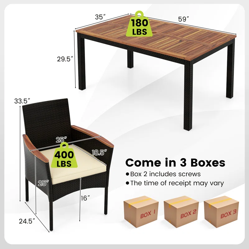 • Note: An umbrella base is required (not included), cushion colors may vary under different lighting, and the set ships in 3 boxes with screws included in box 2.